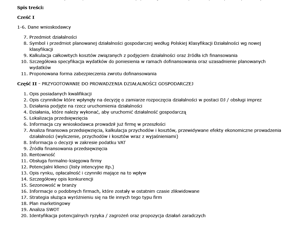 Gotowy wniosek i biznes plan pod dofinansowanie PUP dla firmy o profilu: DJ, obsługa imprez (wesela, studniówki, urodziny, nagłośnienie małych eventów itp.). Dokumenty zostały przygotowane na podstawie wniosku złożonego do Urzędu Pracy w Wągrowcu, które doprowadziły do uzyskania dofinansowania. Liczba stron: 26. Format: PDF + DOC. Poniżej znajduje się spis treści oraz wybrany fragment biznes planu. Do wzoru dodajemy bezpłatnie szczegółowy poradnik dotyczący w całości pozyskiwaniu dofinansowania udzielanego przez Urzędy Pracy w Polsce.