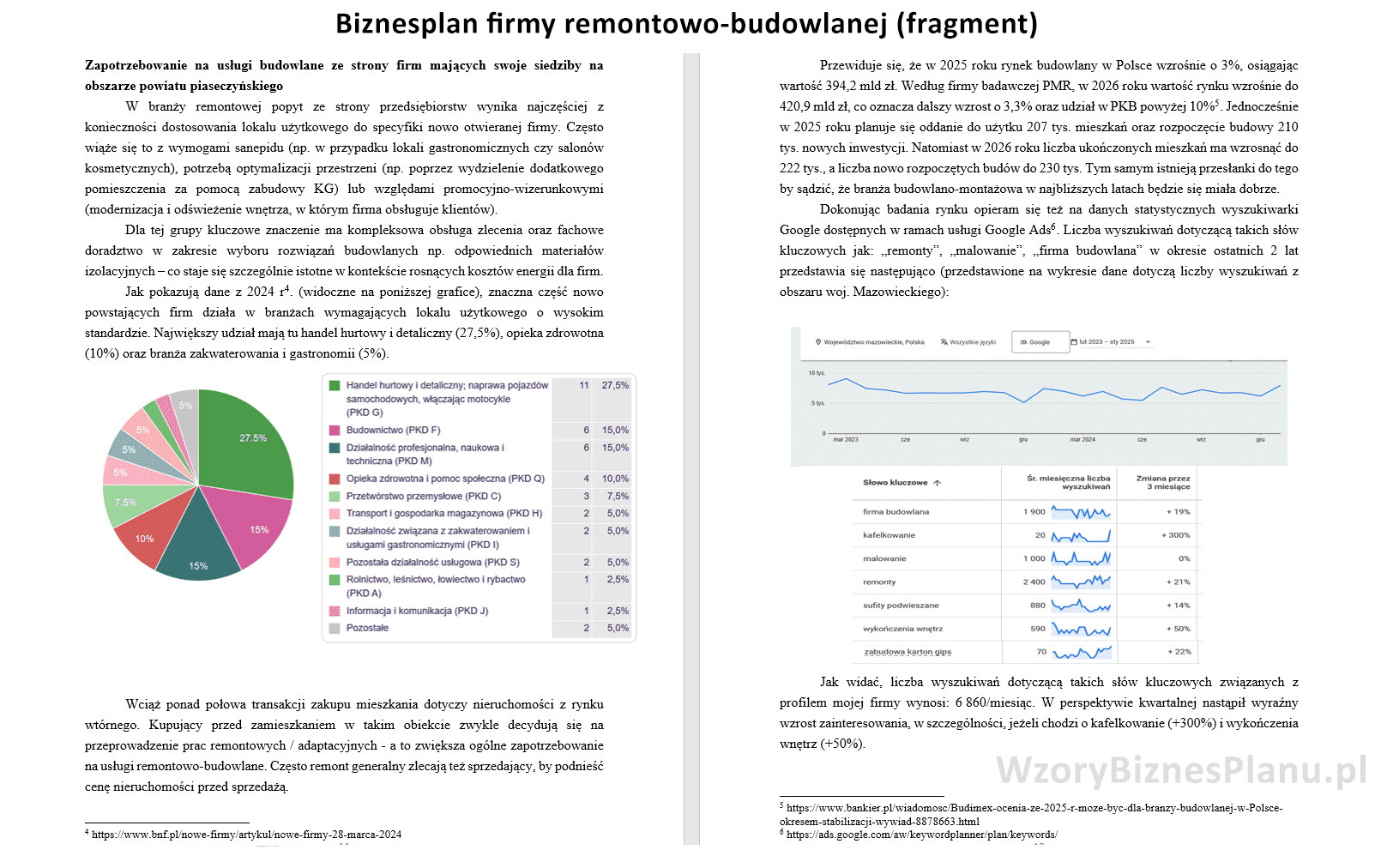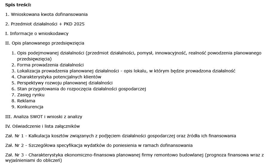 Przykładowy biznesplan oraz wniosek o dotację z Powiatowego Urzędu Pracy. Dokument został opracowany w 2025 roku i doprowadził do skutecznego pozyskania dofinansowania w PUP Piaseczno. Na ilustracjach znajduje się szczegółowy spis treści oraz wybrany fragment. Opisana działalność firmy obejmowała szeroki zakres usług budowlanych, takich jak: zabudowa kartonowo-gipsowa, malowanie, montaż sufitów podwieszanych, kafelkowanie, tynkowanie i inne. Objętość: 36 stron. Format: DOC / PDF (e-book).