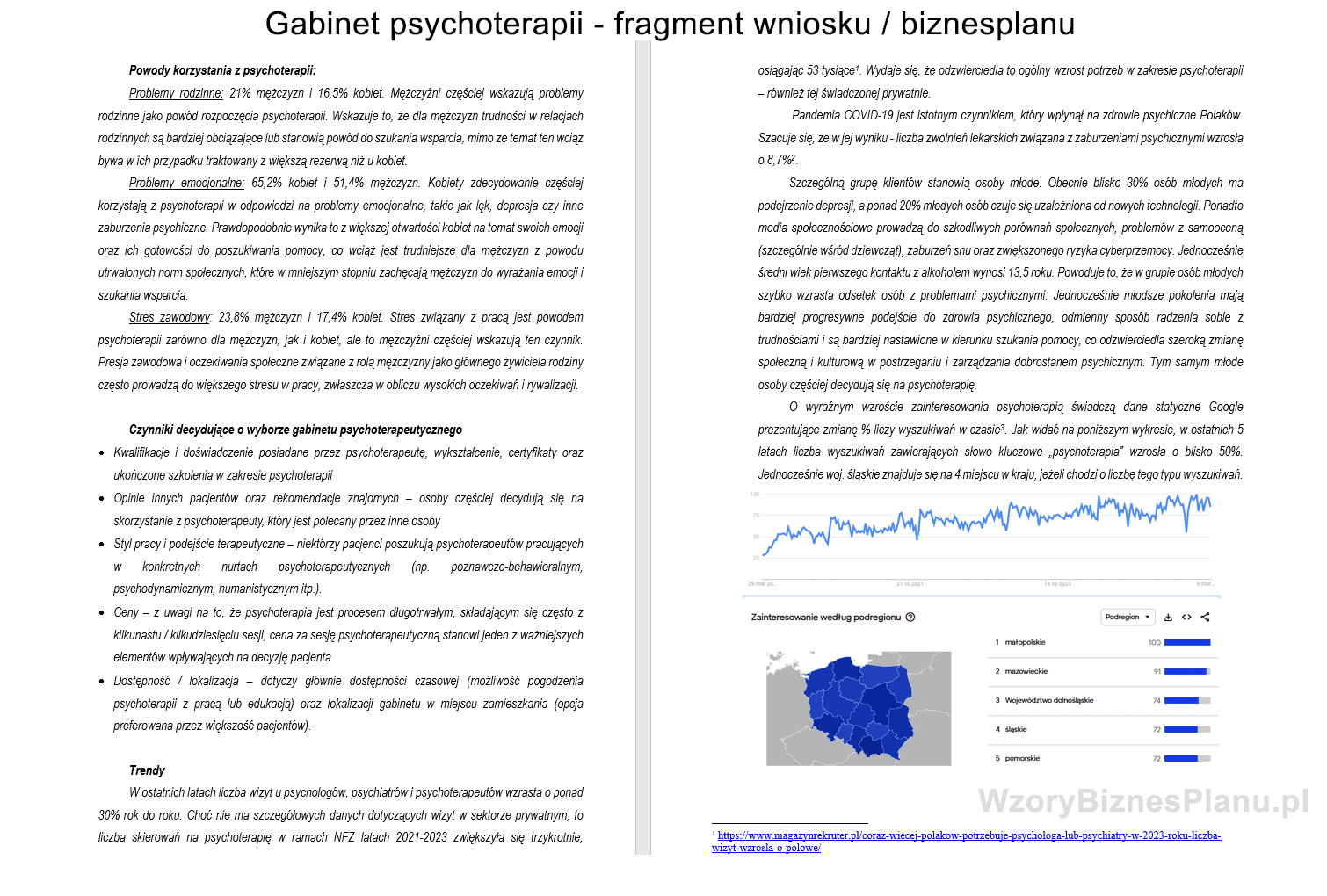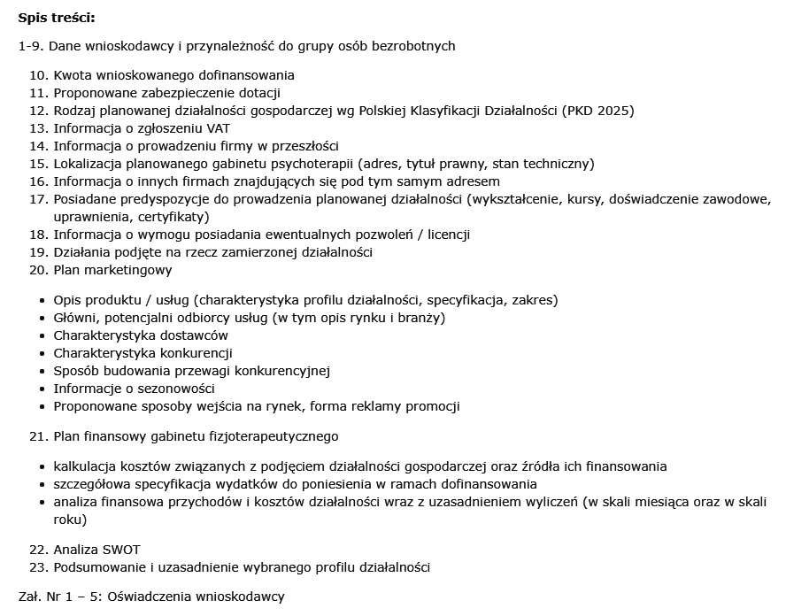 Wniosek i biznes plan dla psychoterapeuty. Zakres działalności obejmuje psychoterapię indywidualną, konsultacje psychologiczne i psychiatryczne oraz diagnostykę psychologiczną itp. Wzór opiera się na dokumentach przygotowanych do PUP Bielsko-Biała. Liczba stron: 34. Format dokumentu: PDF + DOC. Dokumenty uzupełniamy o dodatkowy, wyczerpujący poradnik dotyczący pozyskiwania dotacji z PUP. Poniżej znajdą Państwo spis treści oraz fragment dokumentów.