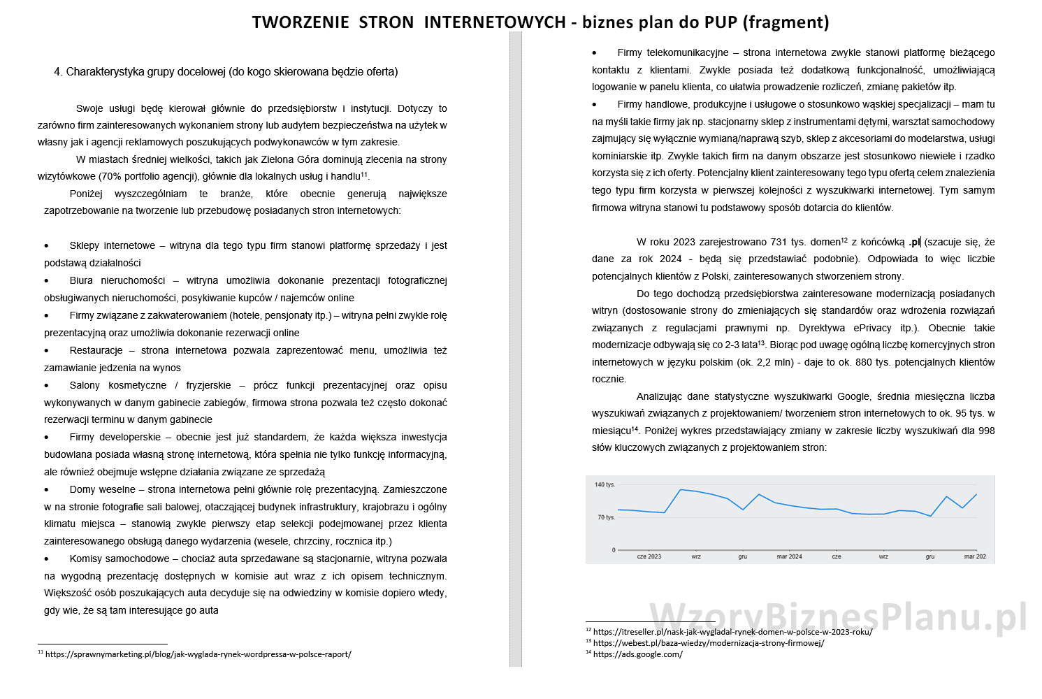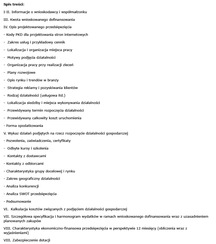 Wzór wniosku i gotowy biznesplan dla firmy zajmującej się projektowania stron internetowych. Dokument został przygotowany do PUP Zielona Góra i skutkował uzyskanie dotacji na podjęcie działalności gospodarczej. Wzór udostępniamy w formatach: DOC + PDF. Objętość: 41 str. Dokumenty uzupełniamy o szczegółowy poradnik dotyczący dotacji i pisania własnego biznesplanu. Poniżej znajdą Państwo spis treści oraz wybrany fragment wniosku.