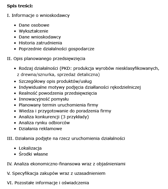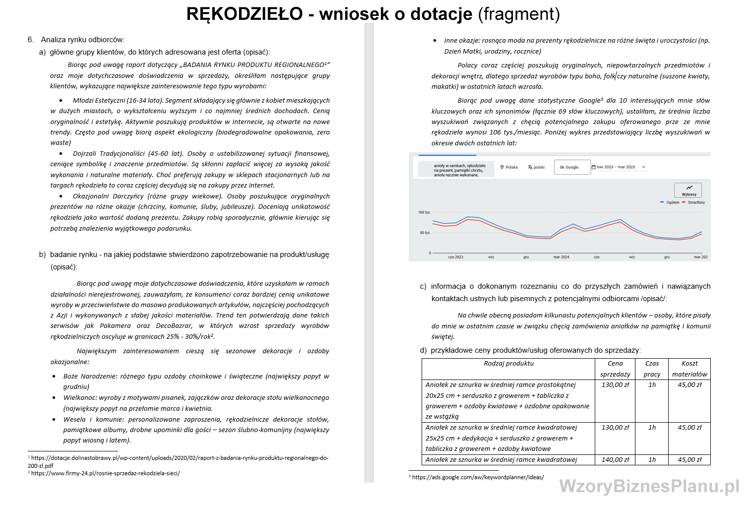 Przykładowy biznesplan oraz wniosek o dotację do Powiatowego Urzędu Pracy. Dokument został opracowany w 2025 roku i doprowadził do skutecznego pozyskania dofinansowania w Rzeszowie. Na ilustracjach przedstawiamy szczegółowy spis treści oraz wybrany fragment dokumentów. Działalność obejmuje wykonywanie i sprzedaż detaliczną rękodzieła. Objętość: 37 stron. Format: DOC / PDF (e-book). Do wzoru załączamy szczegółowy i darmowy poradnik dotyczący dotacji z PUP.