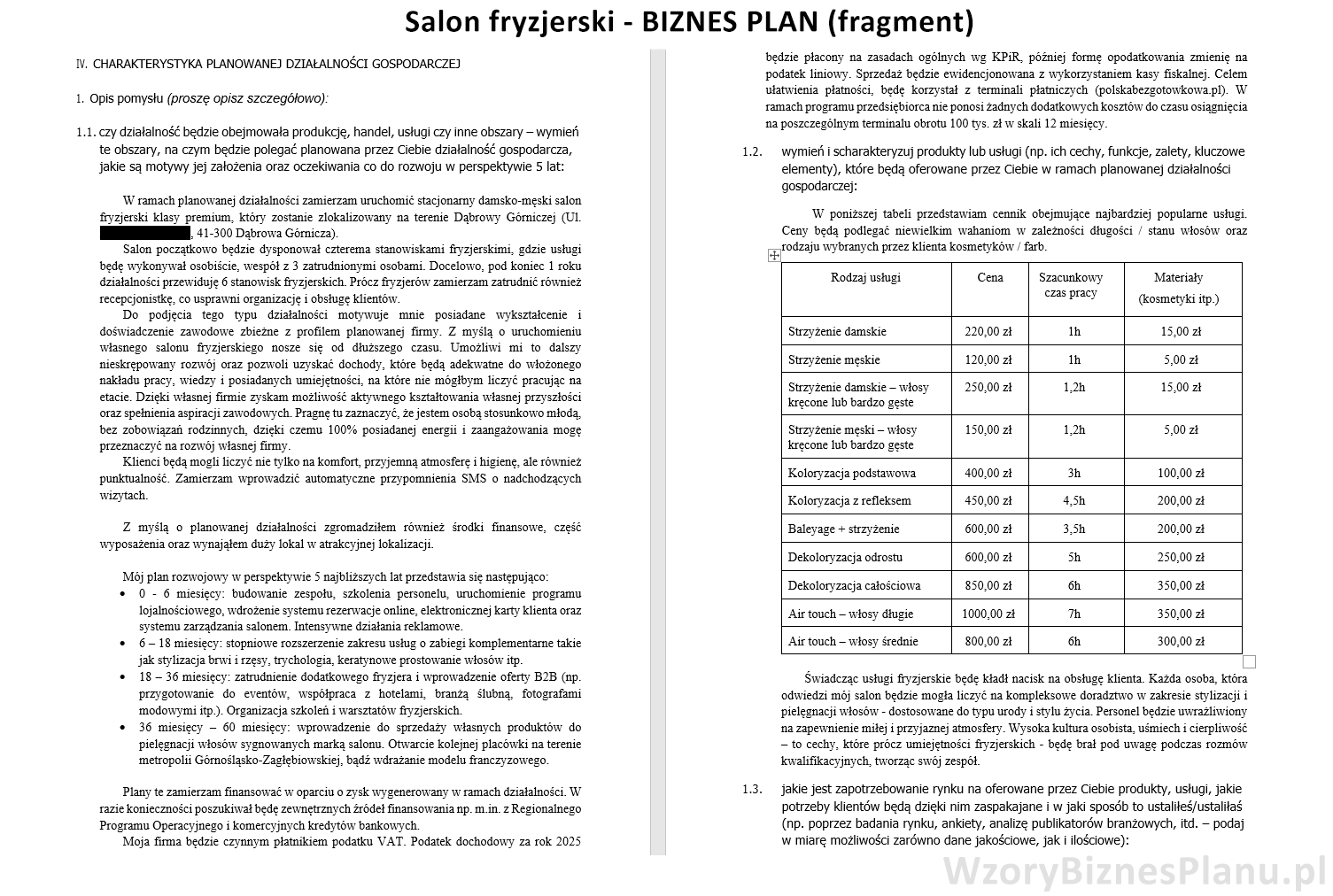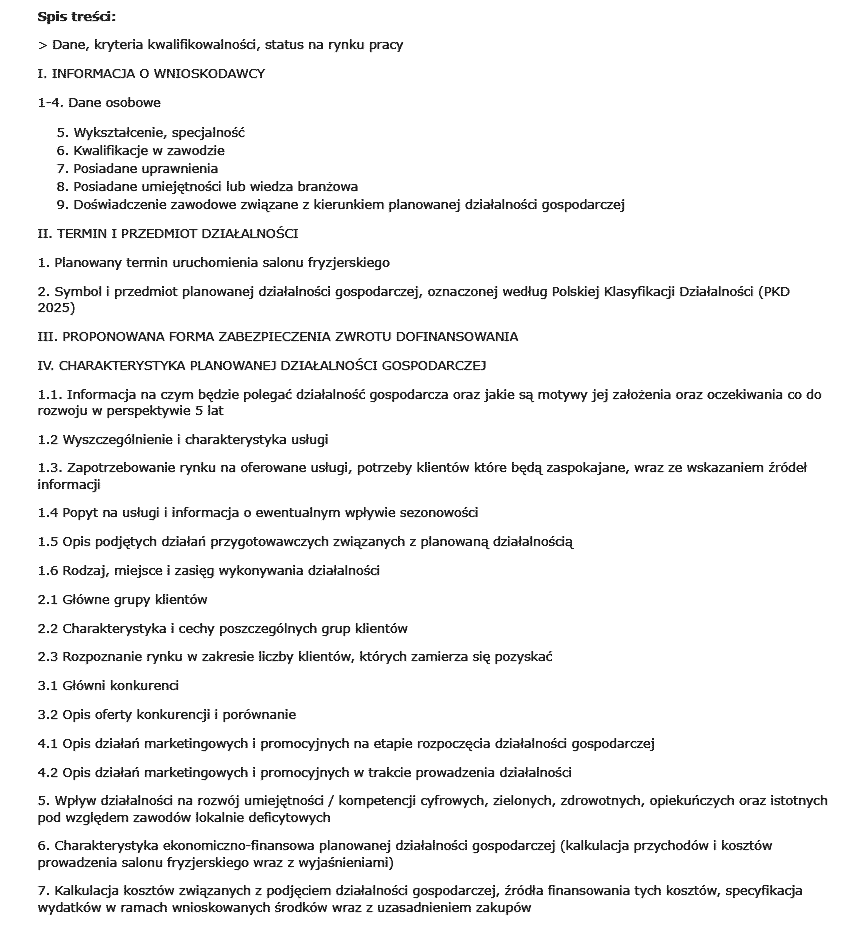 Wzór gotowego wniosku / biznes planu dla salonu fryzjerskiego wykonany na potrzeby dotacji z PUP. Dokument został opracowany zgodnie z wytycznymi Urzędu Pracy w Dąbrowie Górniczej i skutkował przyznaniem dofinansowania osobie bezrobotnej. Wzór udostępniamy w formacie PDF i DOC. Poniżej przedstawiamy spis treści oraz wybrany fragment dokumentu. Wzór jest wzbogacony wyczerpującym poradnikiem dotyczącym dotacji i przygotowania własnego wniosku w celu uzyskania dofinansowania.