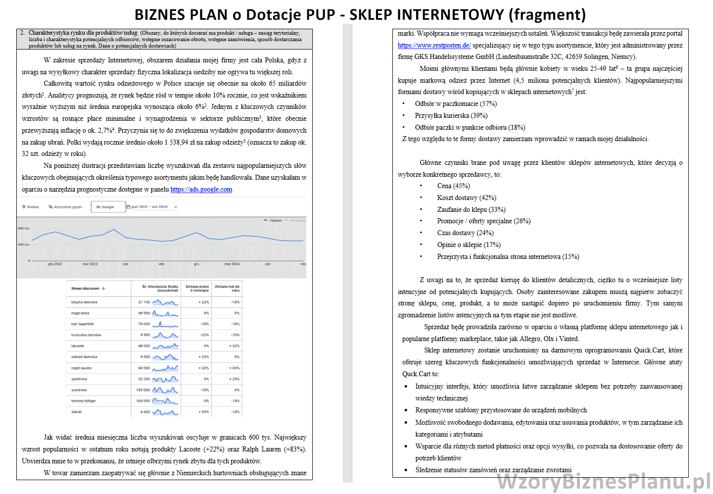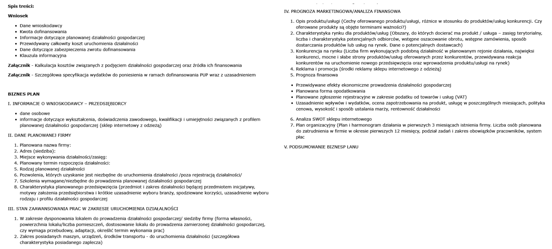 Wzór biznes planu dla sklepu internetowego. Dokument został przygotowany dla Powiatowego Urzędu Pracy w Ostrołęce i skutkował przyznaniem dofinansowania pod koniec 2024 roku. Objętość dokumentów 35 stron. Format PDF + DOC. Poniżej przedstawiamy spis treści oraz fragment zawartości. Jako dodatek, razem ze wzorem udostępniamy szczegółowy poradnik dotyczący ubiegania się o dofinansowanie z PUP.