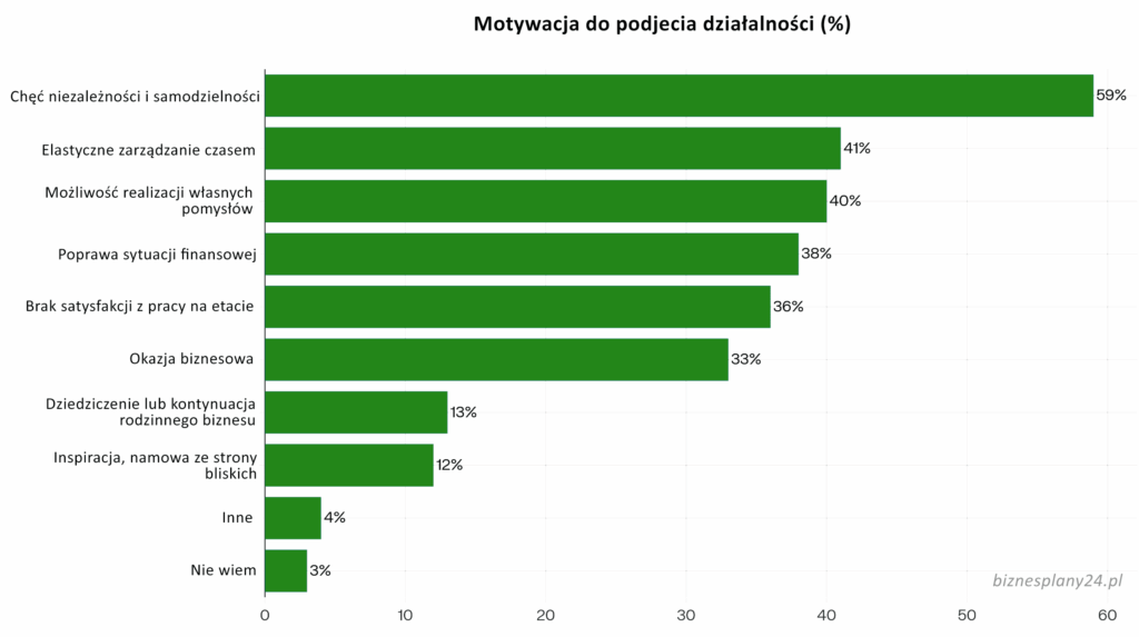 Poniższy wykres przedstawia wyniki ankiety przeprowadzonej przez IBRiS w 2024 roku w zakresie motywacji zakładania działalności gospodarczej.